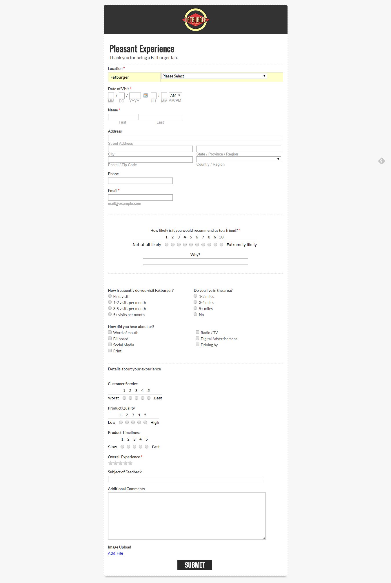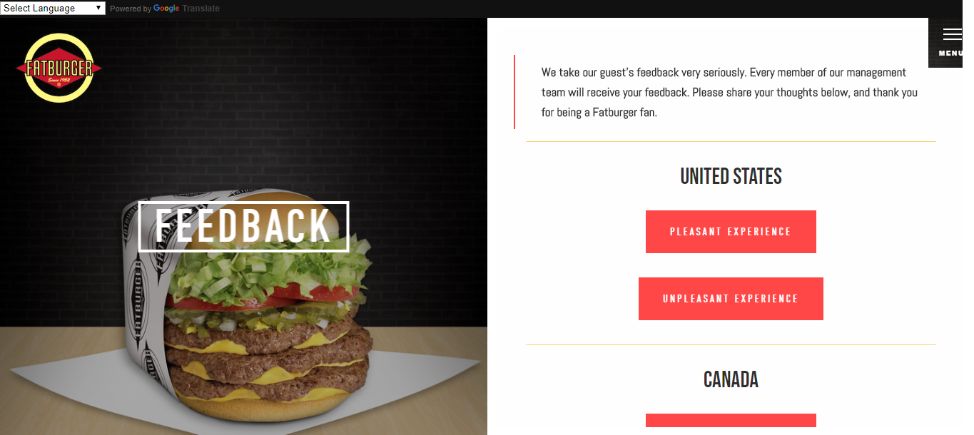 In order to deliver the feedback, the customer will have to pick first whether the visit experience was pleasant or not along with his location (i.e. United States, Canada, or FATBURGER International location). After that customer will have to submit the FATBURGER location, his first and last name, address, phone number and email address (make a note that the phone number and address are optional). Then customers will be asked to rate how often they visit FATBURGER, how likely they will recommend Fatburger to a friend and how they get to know about FATBURGER.