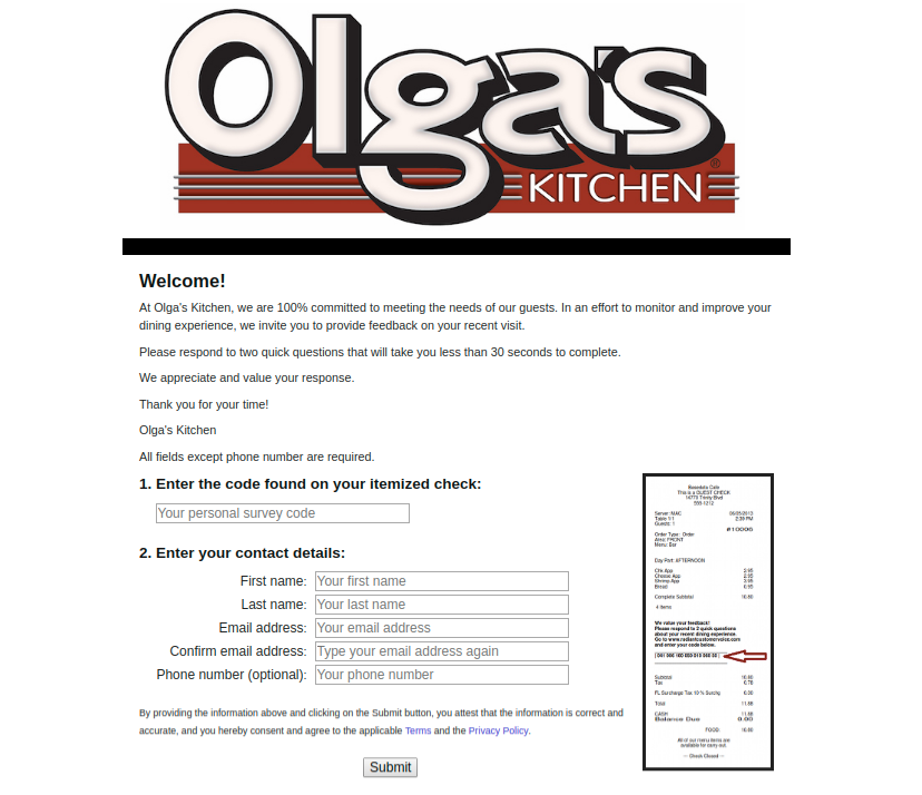 Procedure for taking the Olga’s Kitchen Customer Satisfaction Survey: