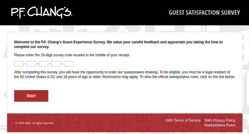 - A recent receipt of the P.F Chang’s is required to enter the survey.