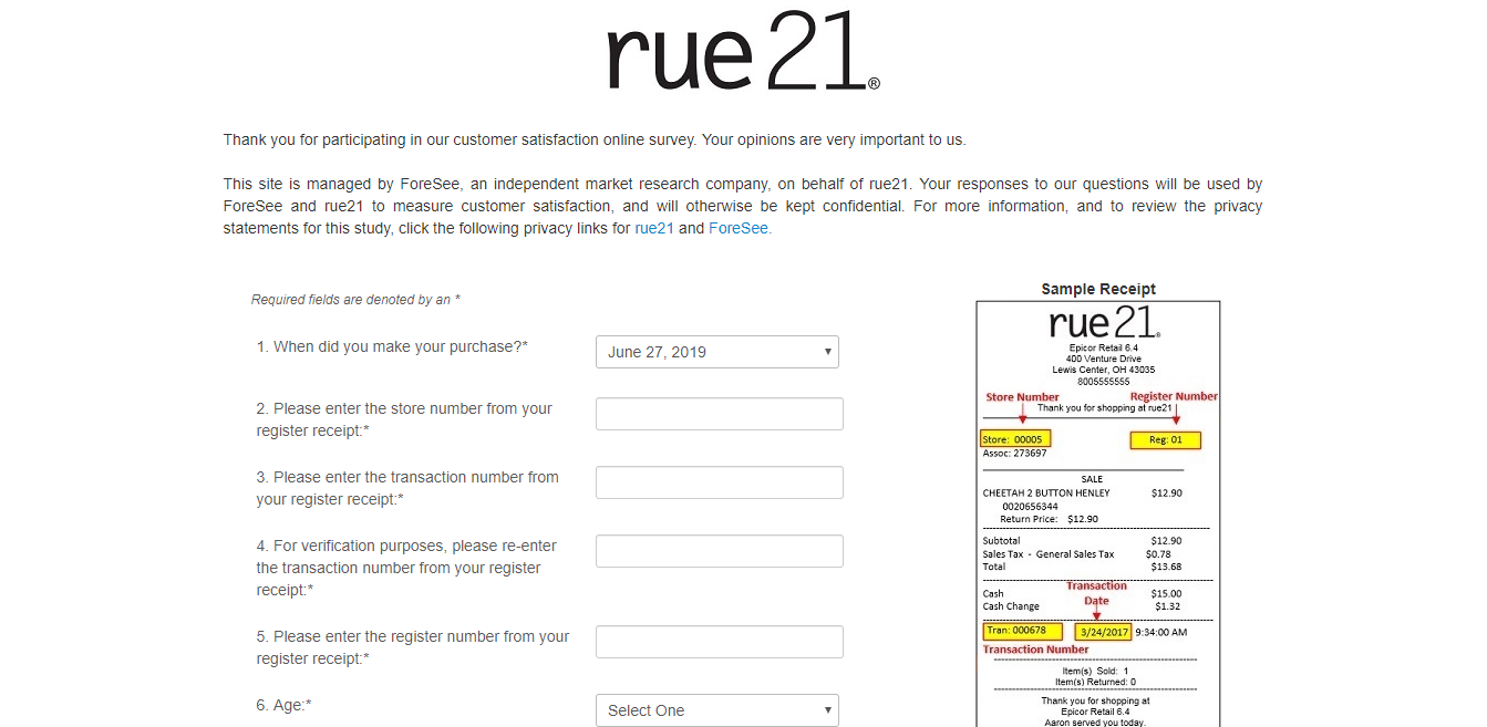 To take complete the Rue21 customer satisfaction survey you need to open the official survey site with the link www.rue21survey.com . Then you need to fill in the below details: